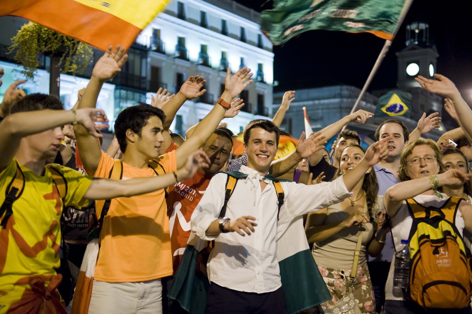 Siempre mostrando una posición de desventaja en la que se hallaban los indignados,acabaron por retirarse sin altercados relevantes.Todos los enfrentamientos fueron verbales que no pasaron a mayores ni con los peregrinos que estaban en los alrededores de la puerta del Sol ni con la policia.